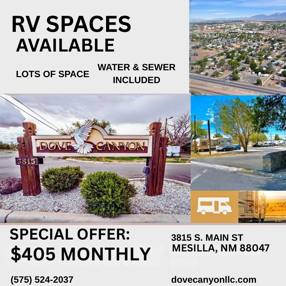 RV parking spots at Dove Canyon Mobile Home Community - $405 per month. Stay for one month or multiple months. No contract. Rent includes water and sewer. Call or text Alexis 575.524.2037.