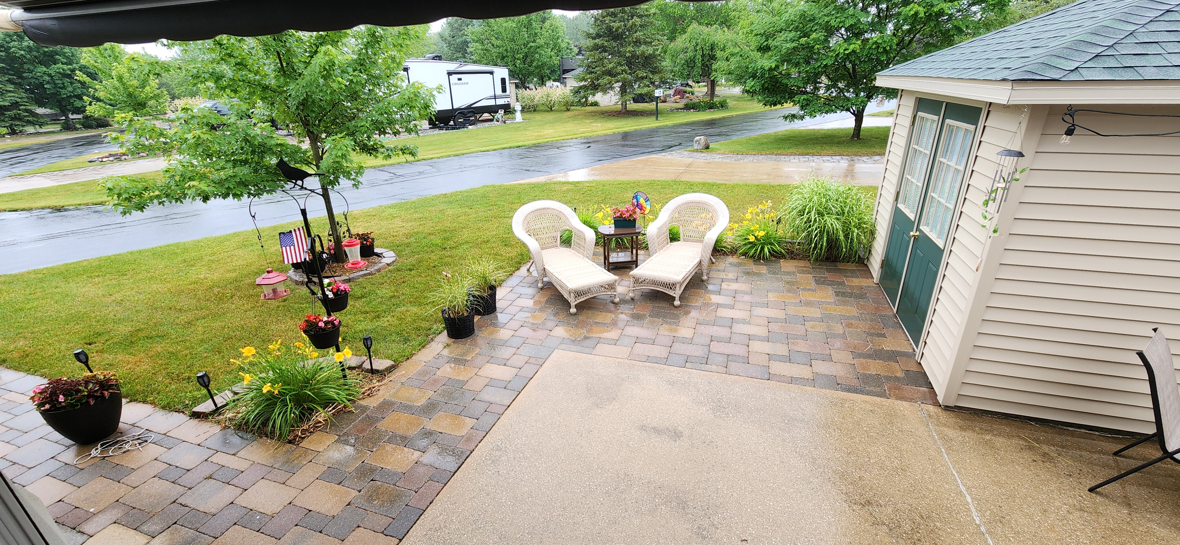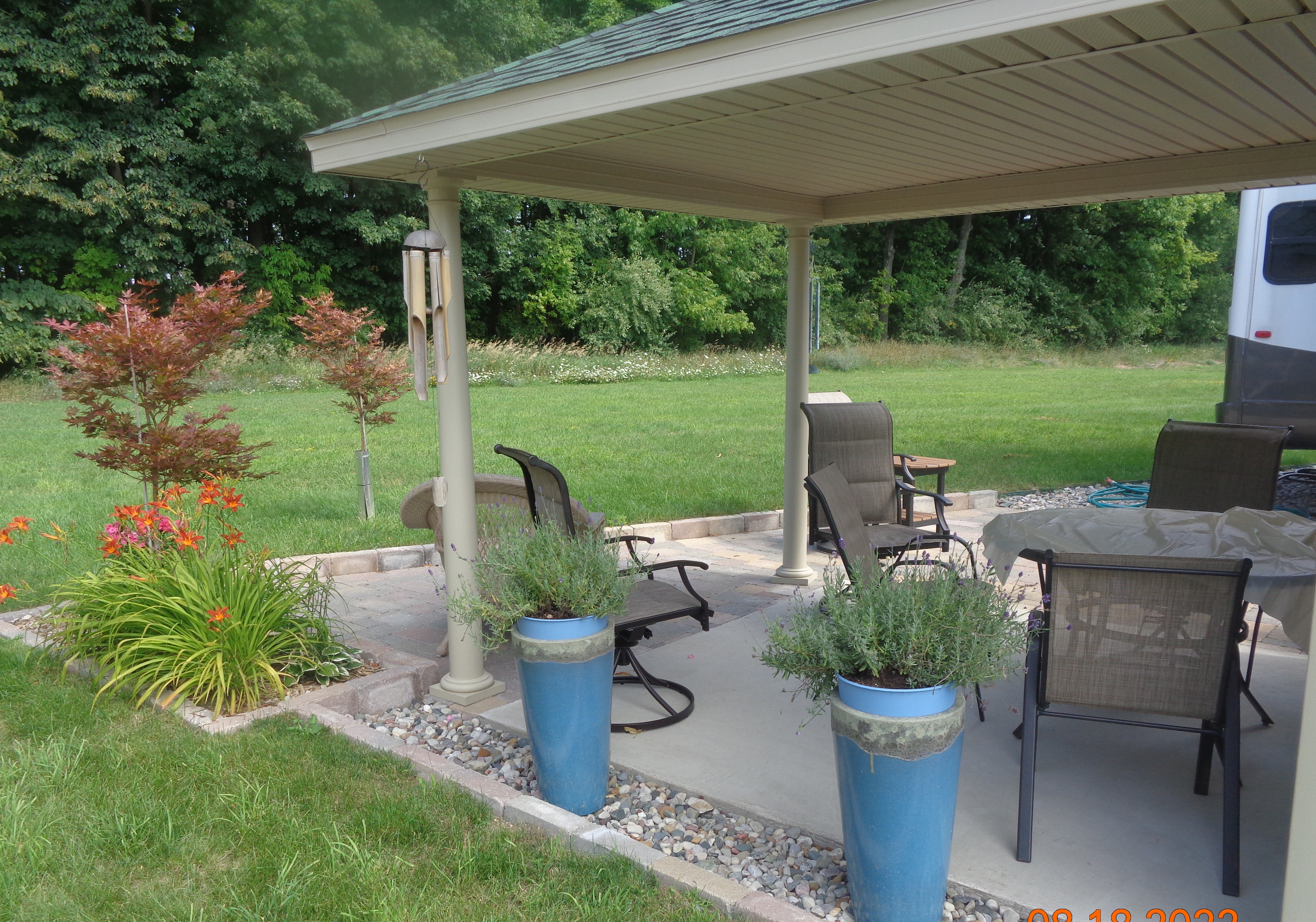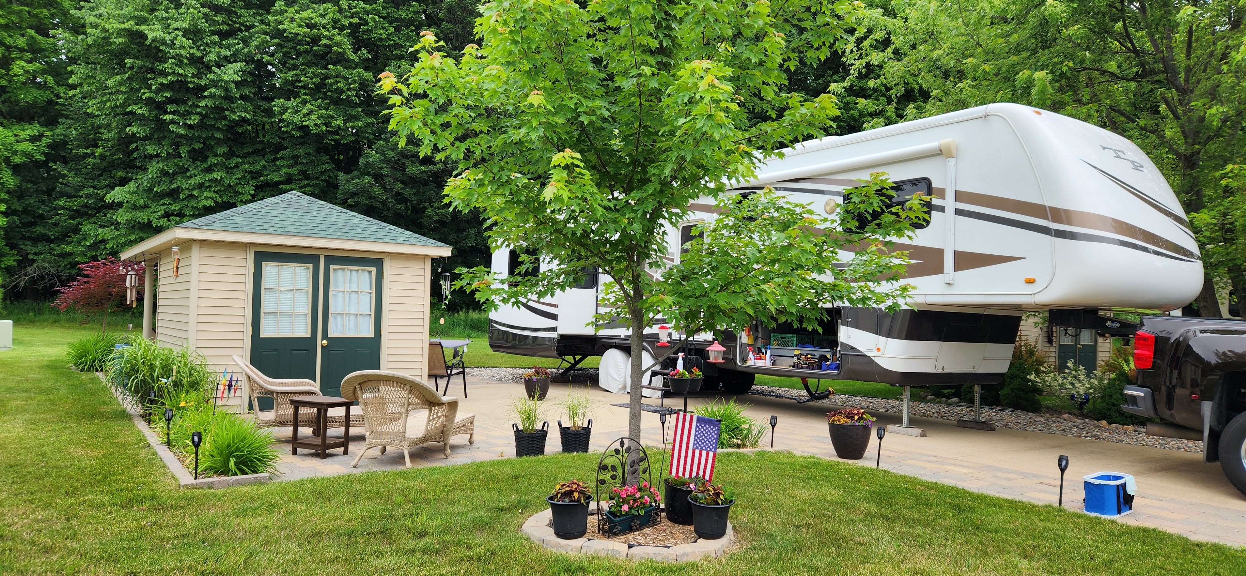 Lot #3 includes a 10’x10’ Coach House with a 10’x10’ porch extension equipped with electricity and cable inside and out. The porch extension faces to the back lawn area of the lot to enjoy the peace and quiet of the open common area and forest. Lot site is 54’ wide by 65’ deep, with expansive paver patio under and around the Coach House area and throughout the lot providing plenty of room to entertain and enjoy outdoor sitting. Extra rows of pavers along each side of the drive allow for additional vehicle or golf cart parking. Large Autumn Blaze Maple Tree in front, Japanese maples at the rear of the lot and perennials decorate the patio and Coach House perimeter and as well as providing some privacy and shade during the day.