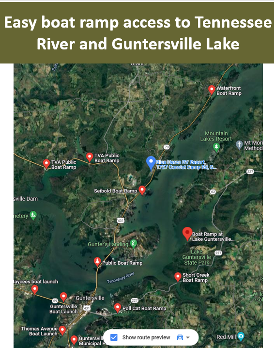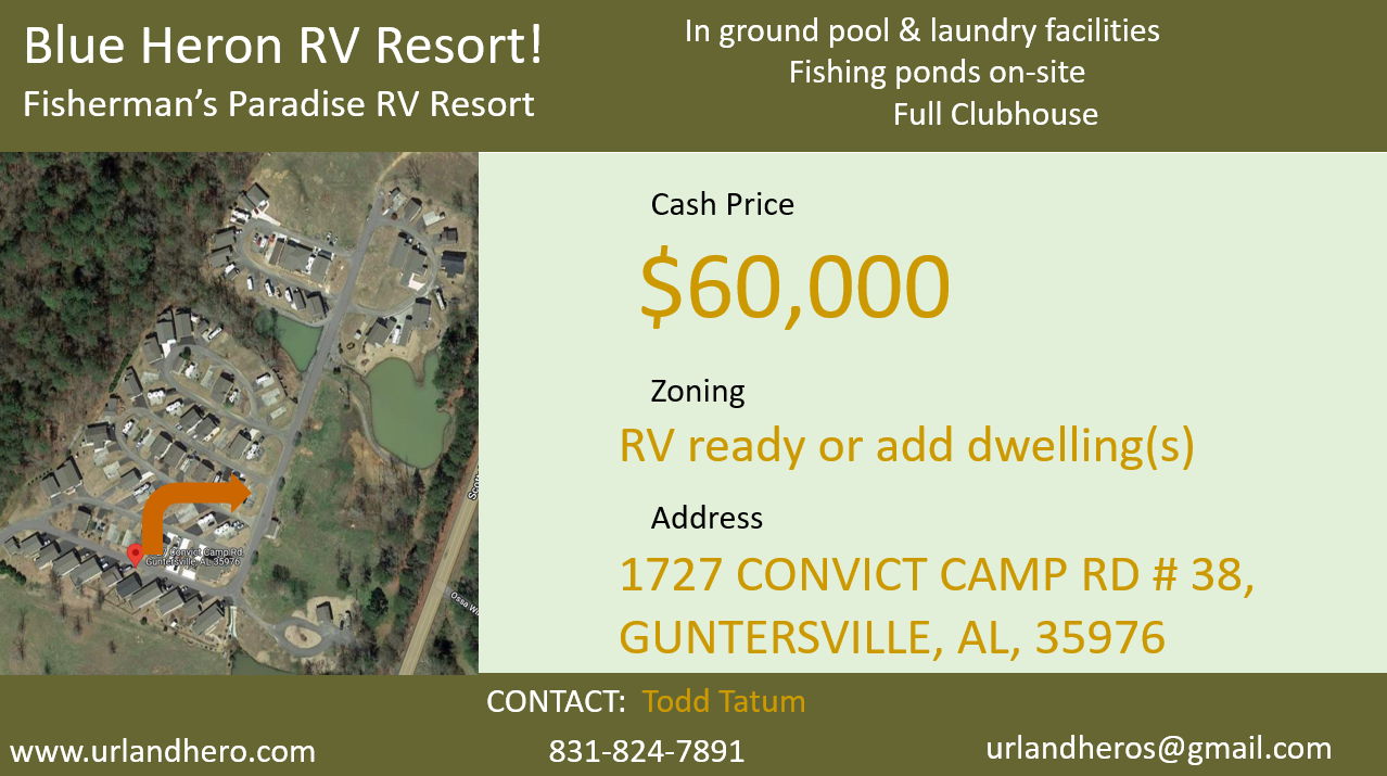 Blue Heron RV Resort! Conveniently located to Guntersville, Scottsboro, and Huntsville - This RV resort community features in-ground pool, bath and laundry facilities, a walking trail, and clubhouse with a full restaurant style kitchen and top of the line exercise equipment and fishing ponds. Speaking of fishing it is located in the heart of Lake Guntersville’s premier bass fishing and is Close to many public boat launches, a fisherman's dream! This pull through lot is ready for you to build the port home of your dreams or simply enjoy the RV life!