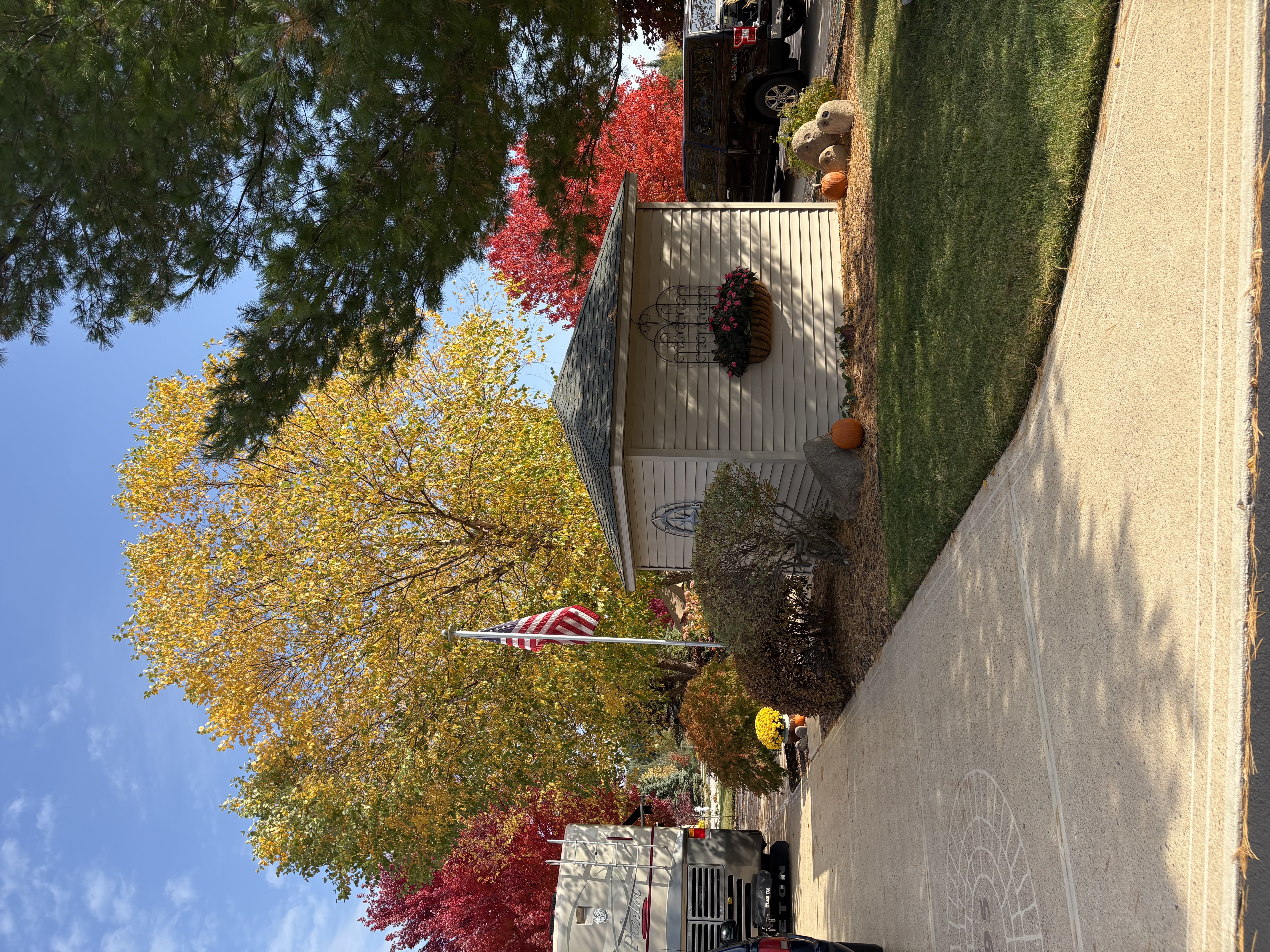 Rv pad is epoxy coated concrete with additional pavers and decorative stone walls on the expanded patio. Multiple locations in the flower beds or on the walls with platforms for annual flower plantings in flower pots are available.