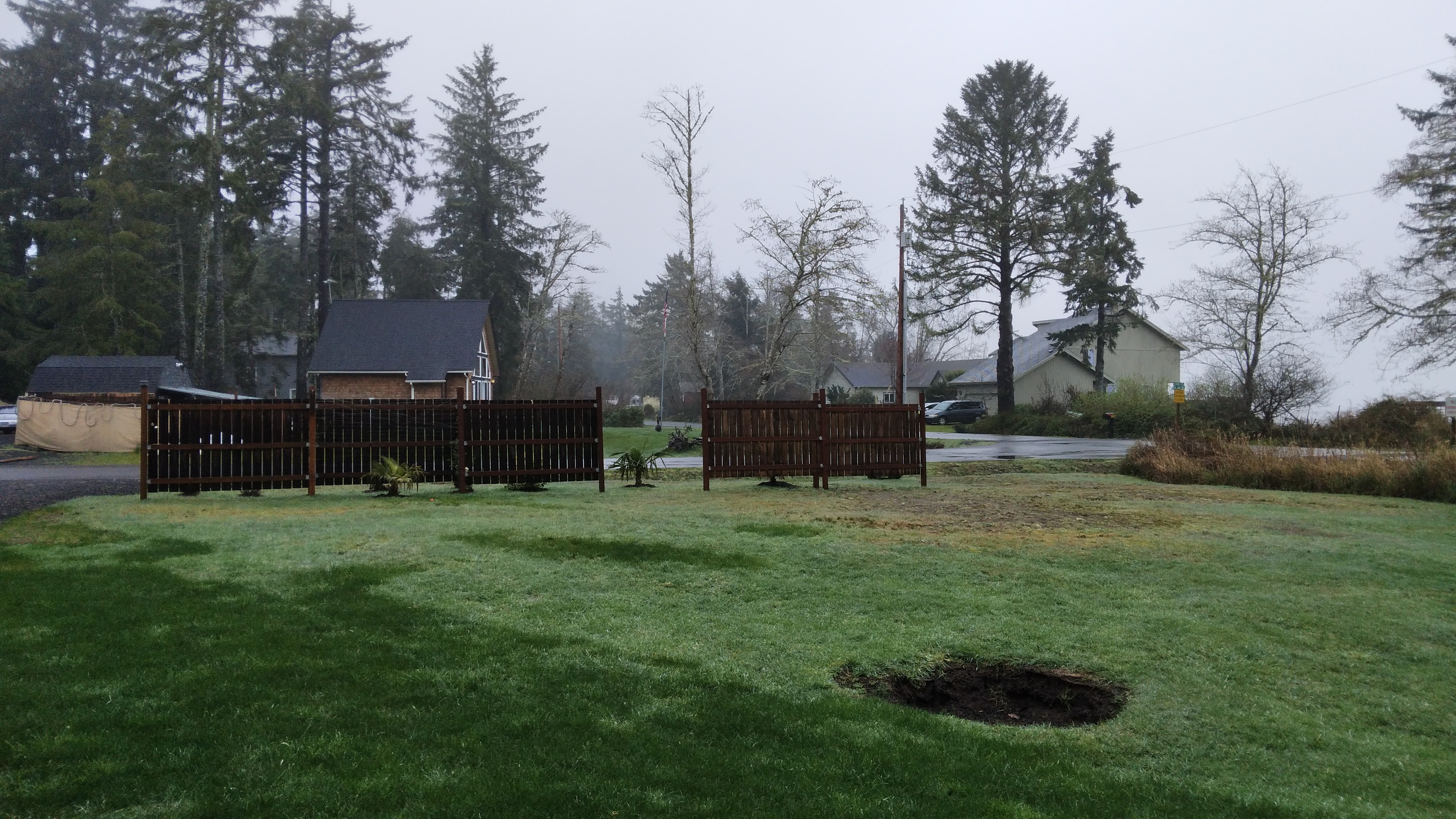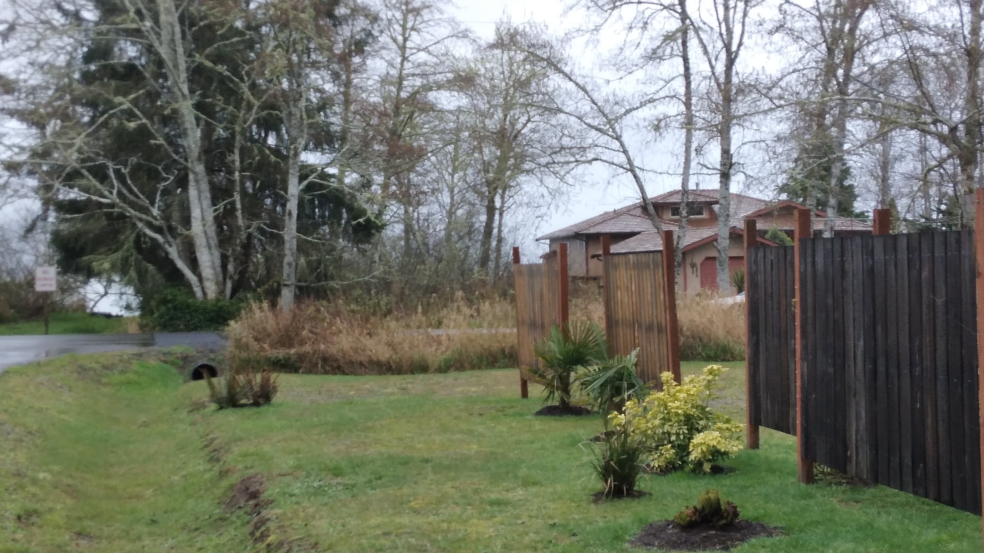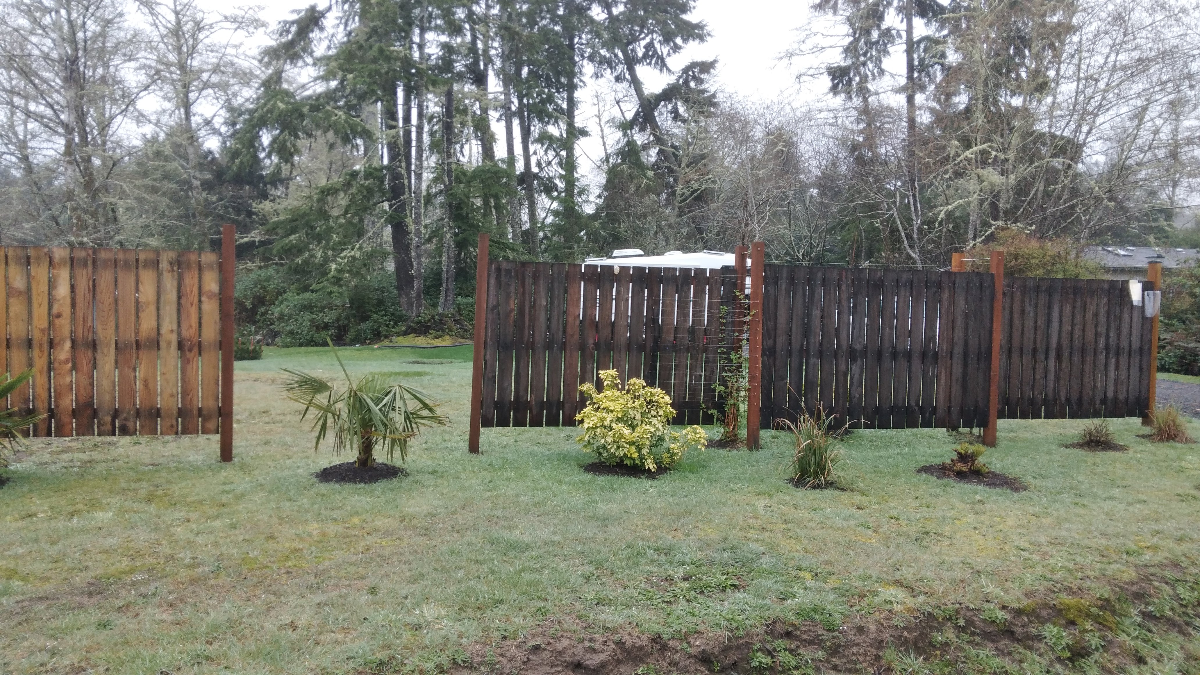 Landscape fence and shrubs ( nor. pine, weeping cedar, several palms, Hydrangea and others)