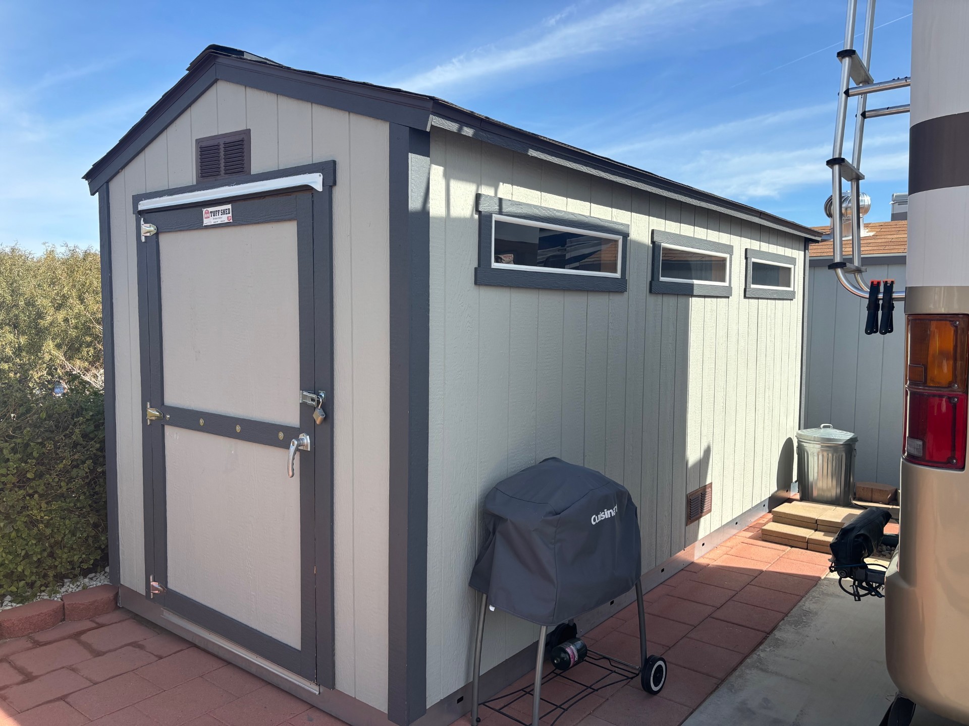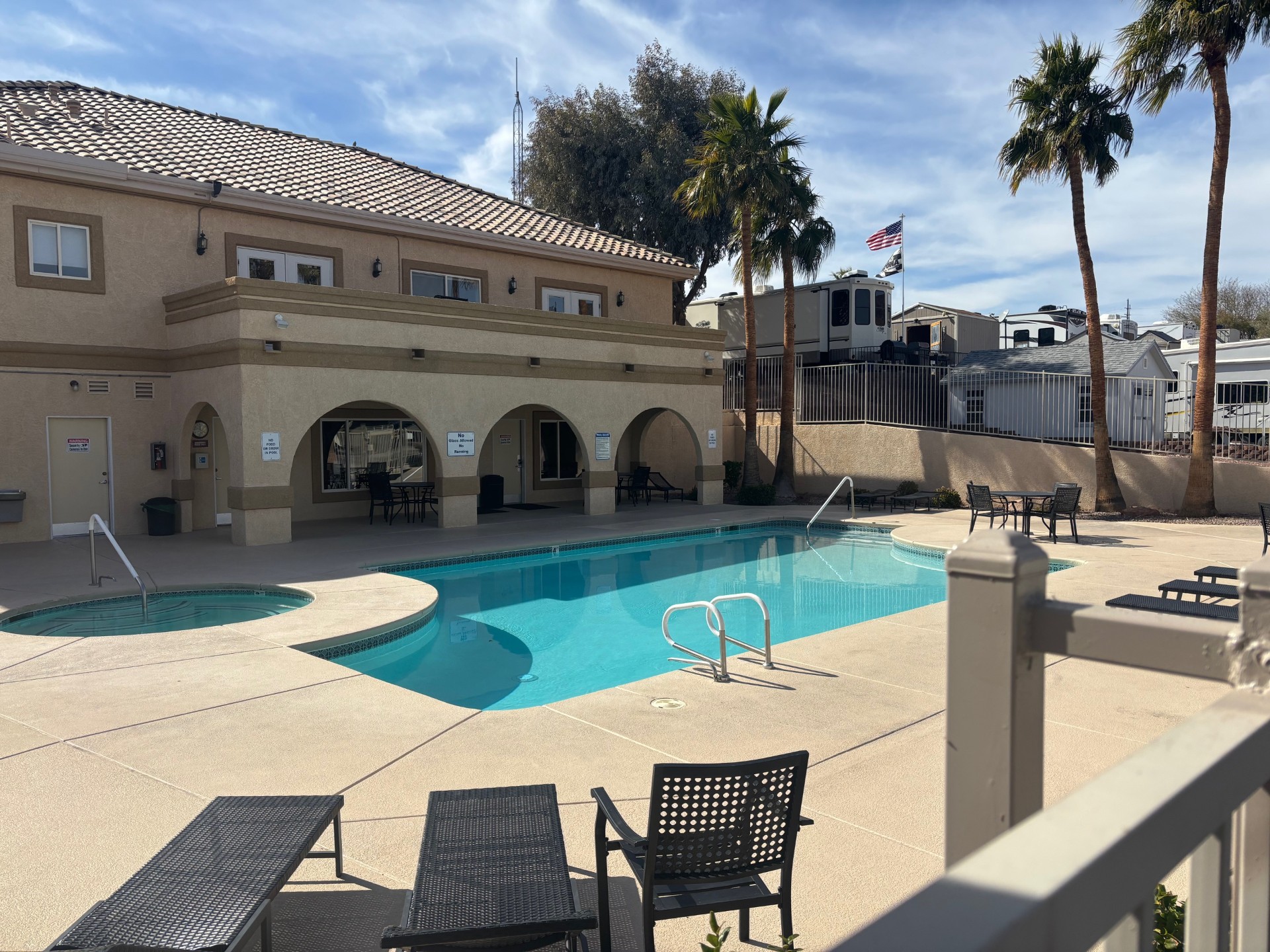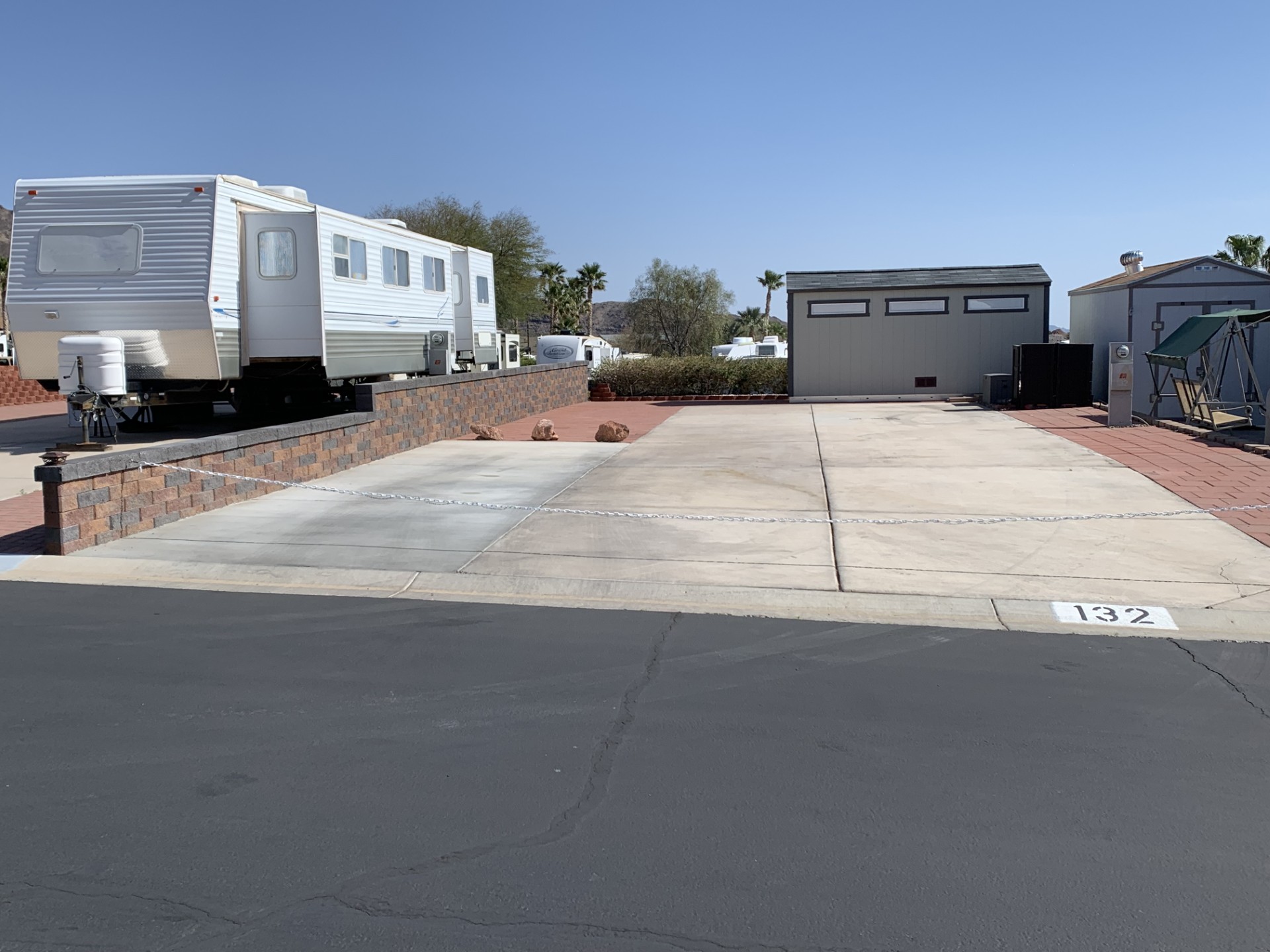 #132 is a 30ft. x 70 ft. lot very close to the pool, fitness, lounge, bath, showers and laundry. Nice lot location also is elevated above lower street for enhanced privacy. With concrete parking area and patio pavers plus a large 7 ft x 16 ft. Tuff Shed with power. Lot has 20/30/50 amp electric, water, sewer & cable TV hook up. Reasonable monthly resort dues include cable TV boxes and water/sewer. The electric meter is on lot and billed on usage monthly.