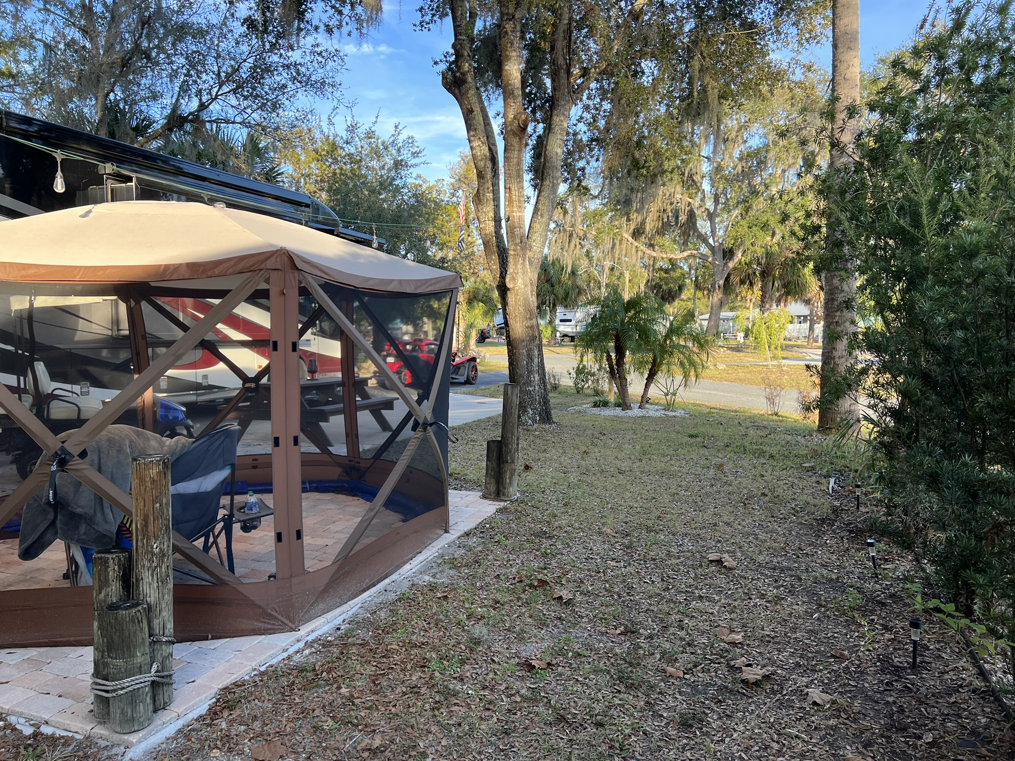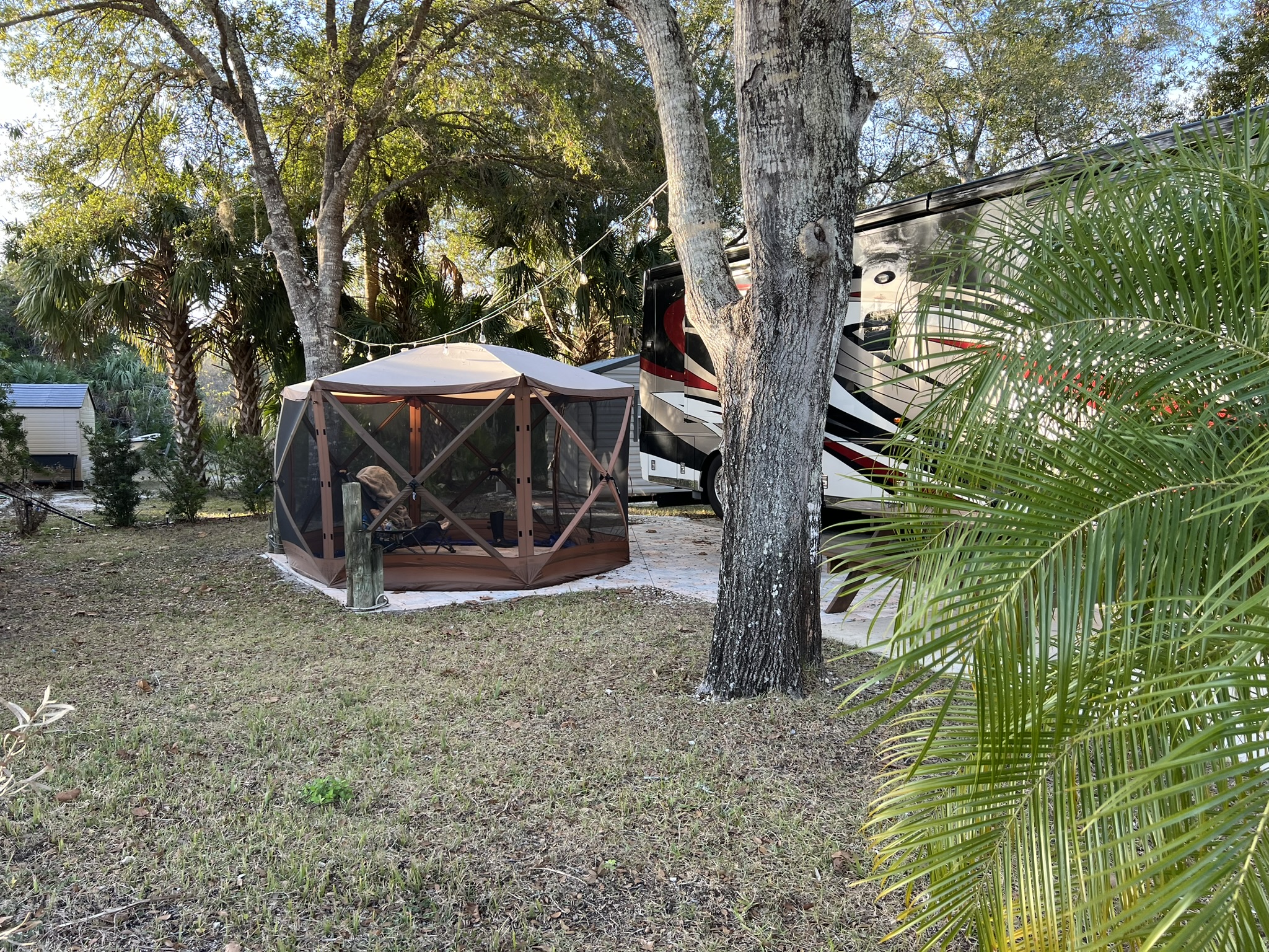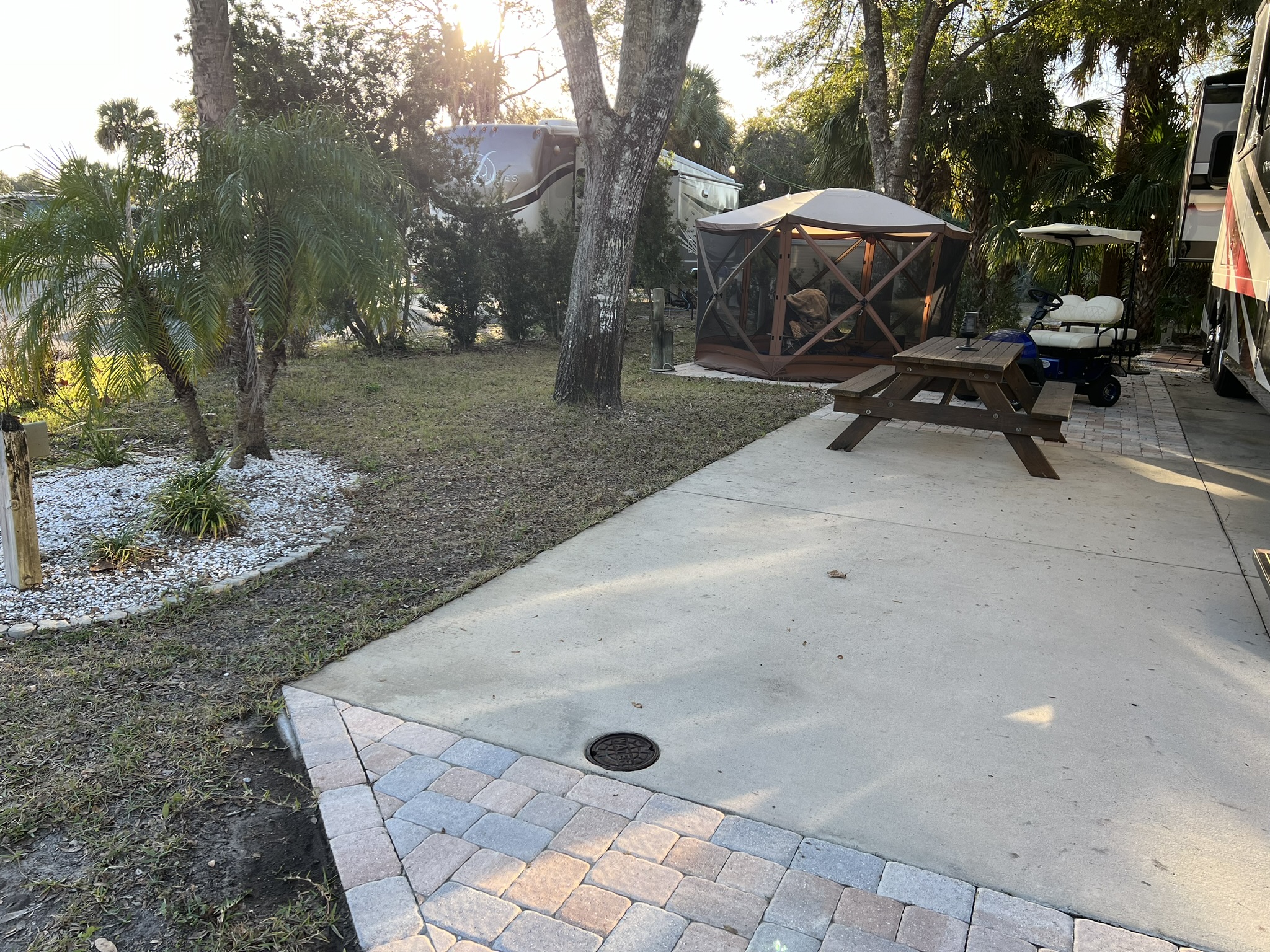 The spot has an automatic watering system and lawn care is provided by the resort. The lot backs up to a large wooded area and it is one of the most covered spots in the park giving you nice shade on a hot Florida day.