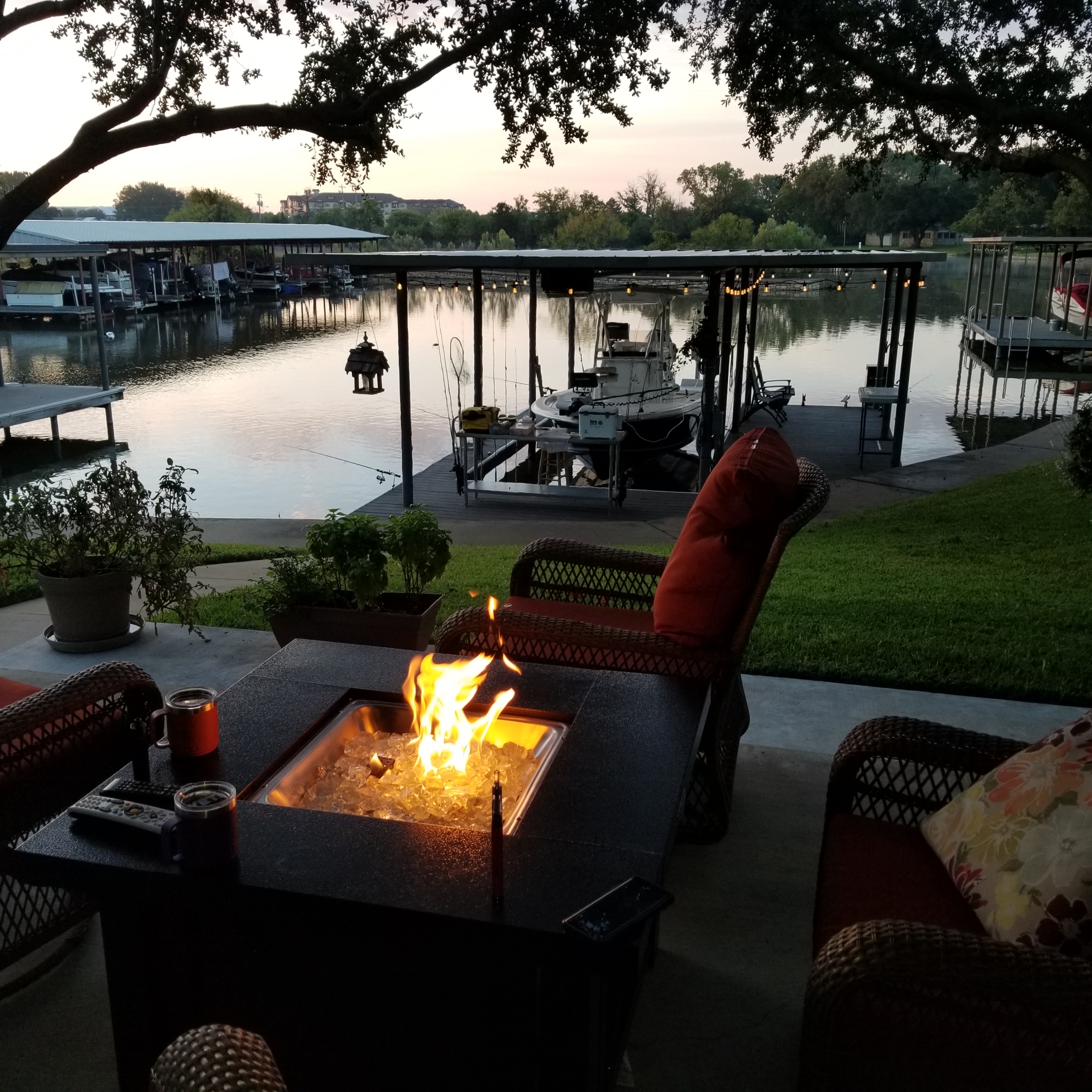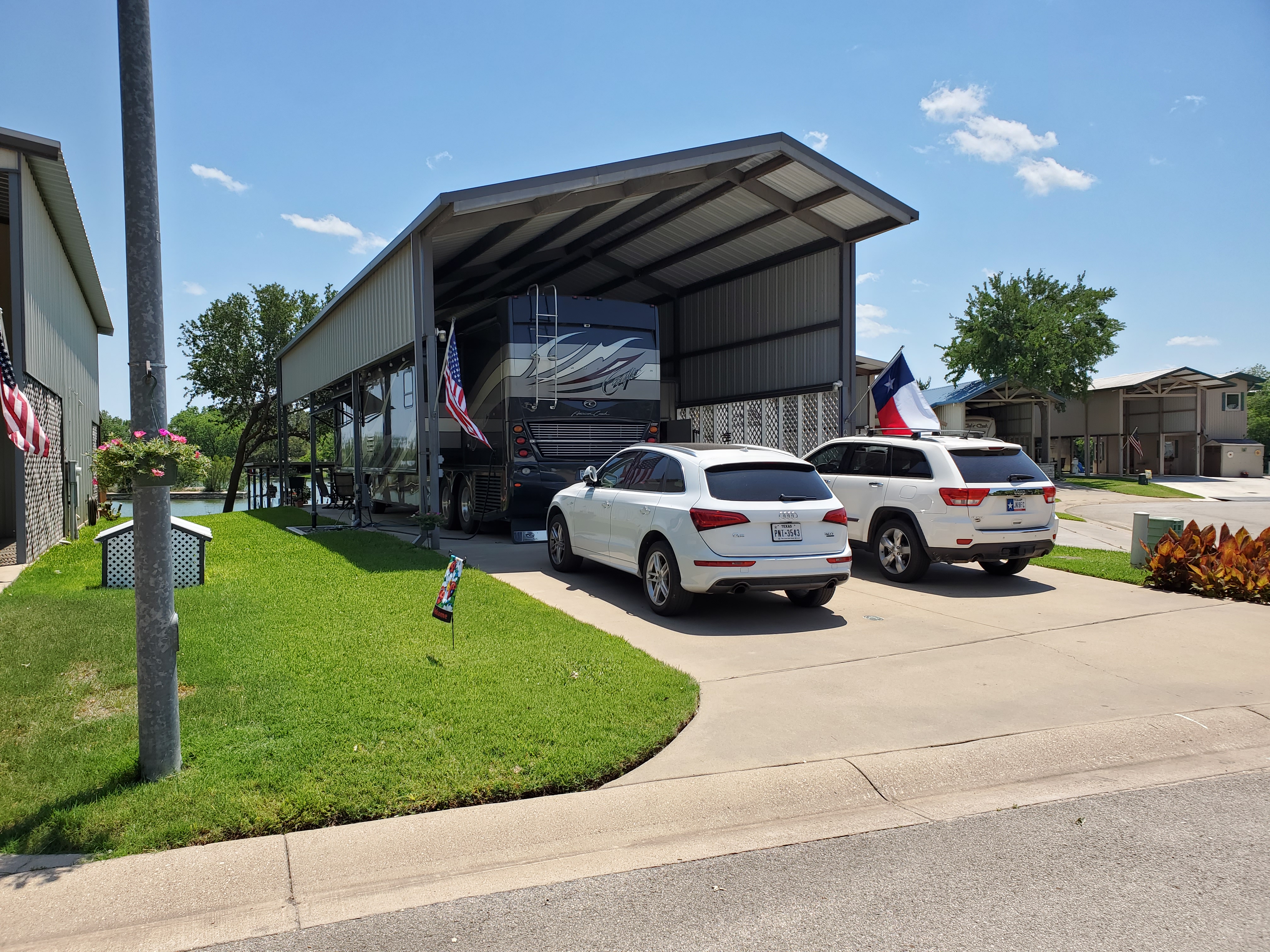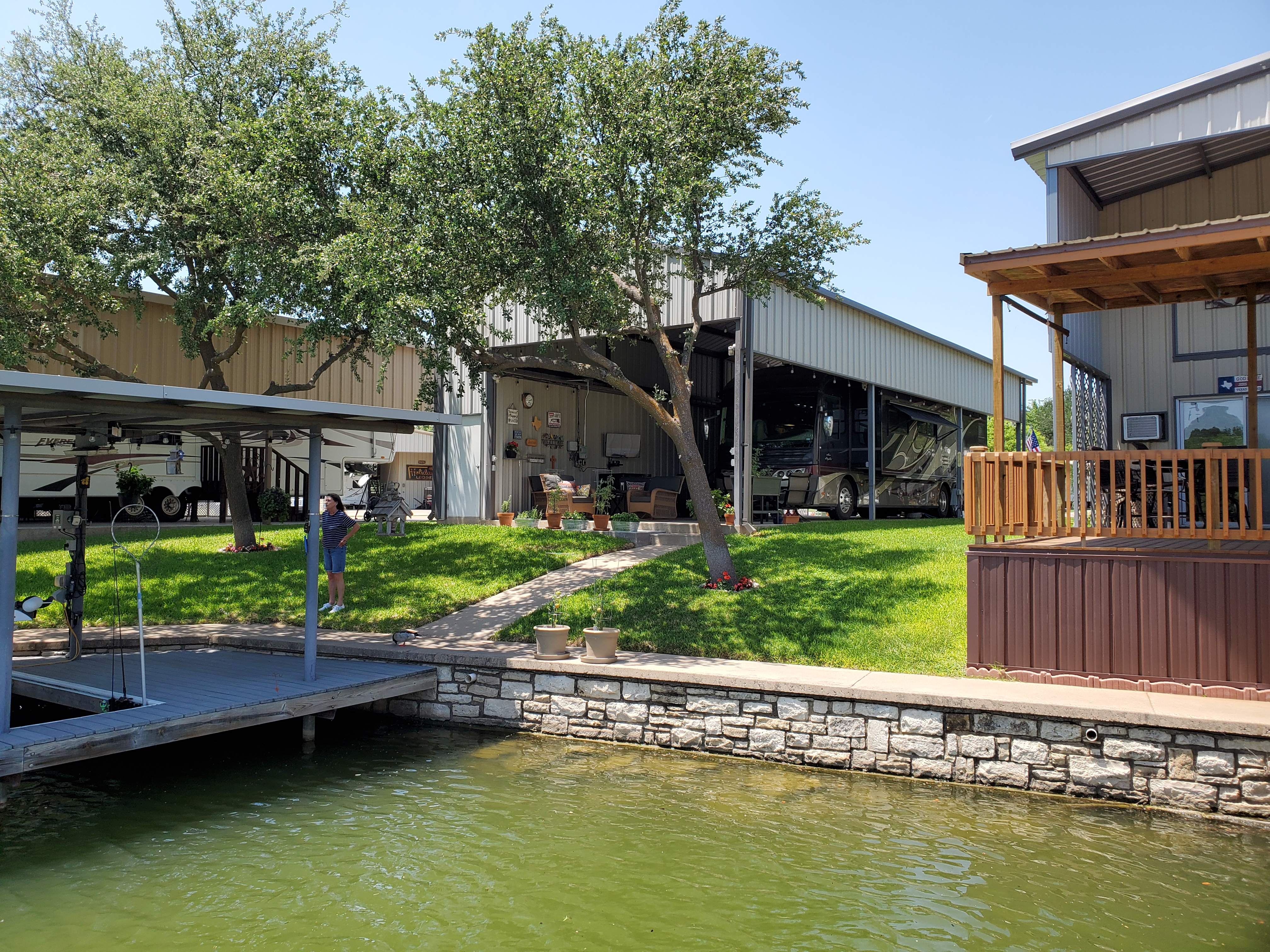 Property features a 24ftX60ft slab to accommodate motorhomes, 5th wheels, campers, and tiny homes / park models. 50/30 amp power, city of Granbury water, sewer, and power. Yard is fully irrigated with primarily St. Augustine grass. This is a unique property in a unique location with its proximity to downtown Granbury which is within walking or biking riding distance. Fishing is good with bass, catfish, and crappie, in abundance. At full lake capacity, the water just off the back of the dock is approximately 10ft. Waterfront is approximately 50+ feet. Two storage units have insulation and electricity and are approximately 6ftX20ft each.