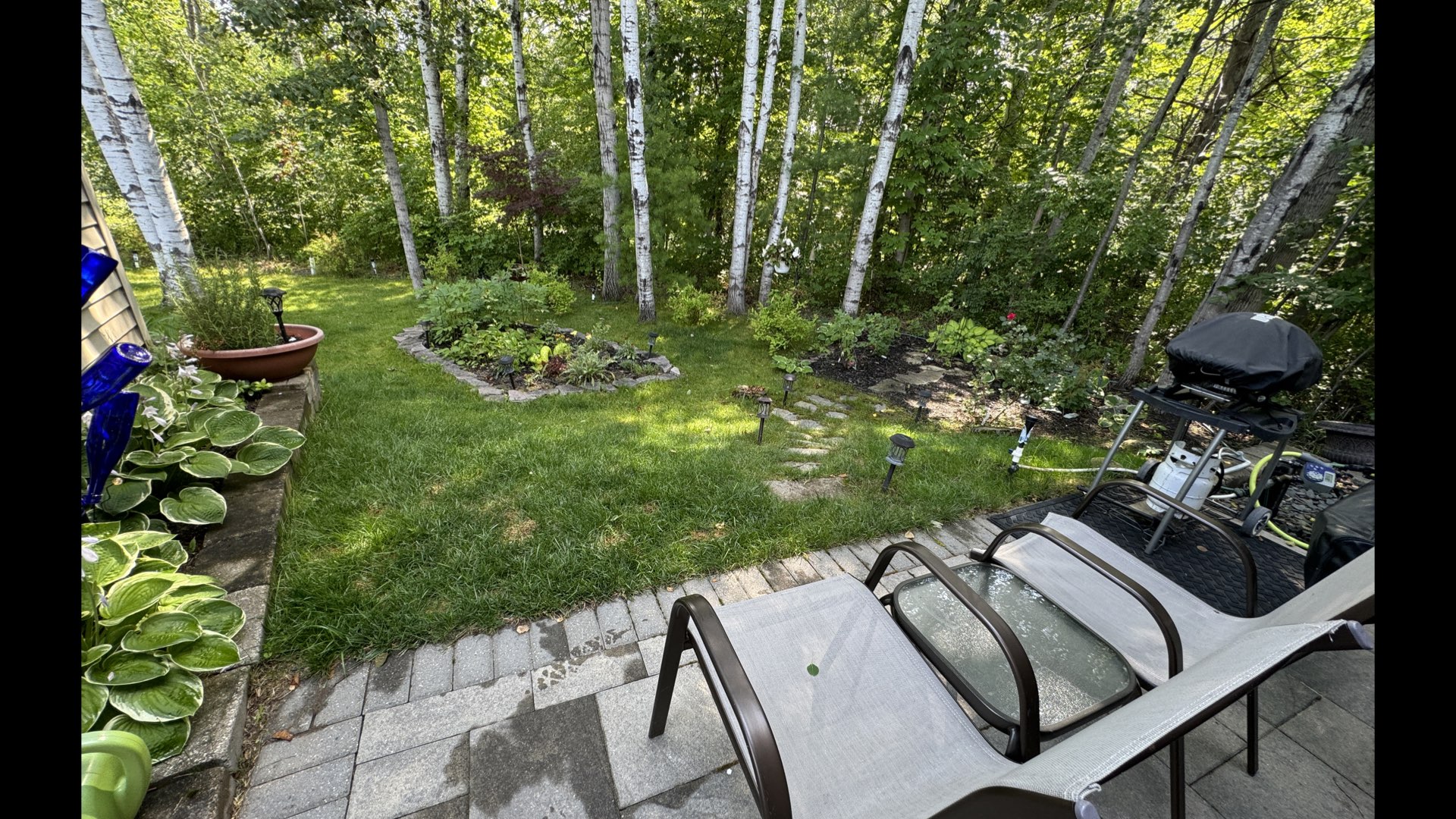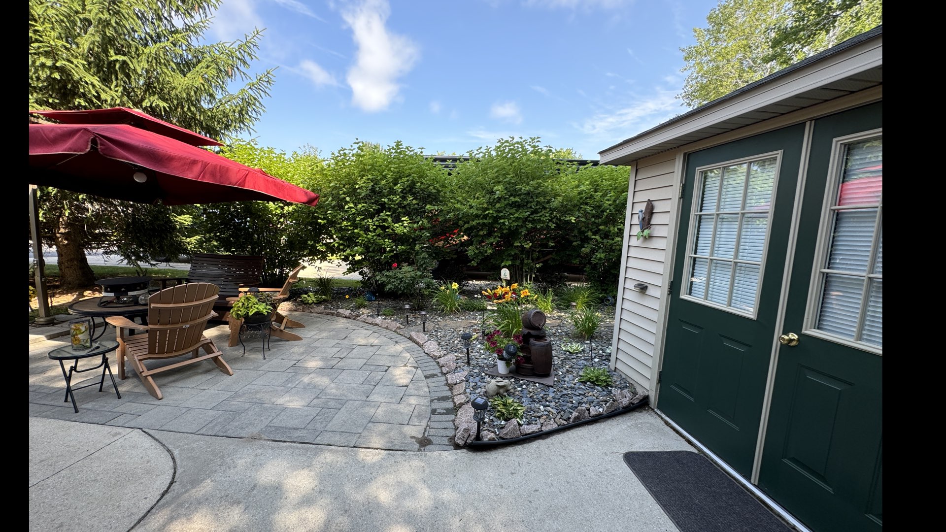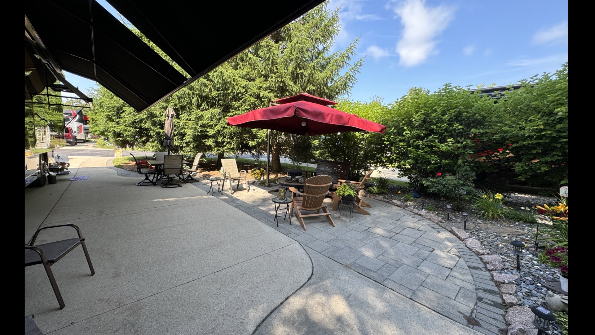 • All Patio Furniture Included: Dining set w/ Umbrella, Polywood Glider & folding Adirondack Chairs, Fire Pit on Table, Weber Grill, 10x10 Patio Umbrella w/spare Canopy (illuminated), Fountain